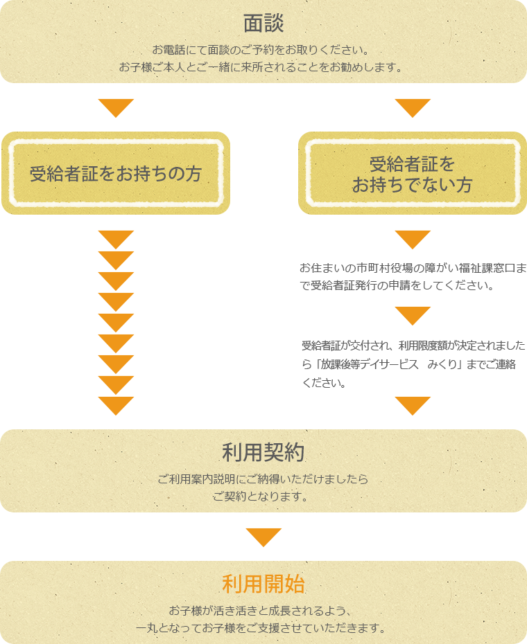 放課後等デイサービス みくりでは、ご利用を開始してからの「ここはうちの子に合わないかも・・」を防ぐために、まずはお子様に無料体験に来ていただく前に放課後等デイサービス みくりで行う療育について保護者様に丁寧にご説明させていただいております。放課後等デイサービス みくりで行う療育についてご納得いただけましたら無料体験をご利用される日時をお教えいただきましたらご予約させていただきます。